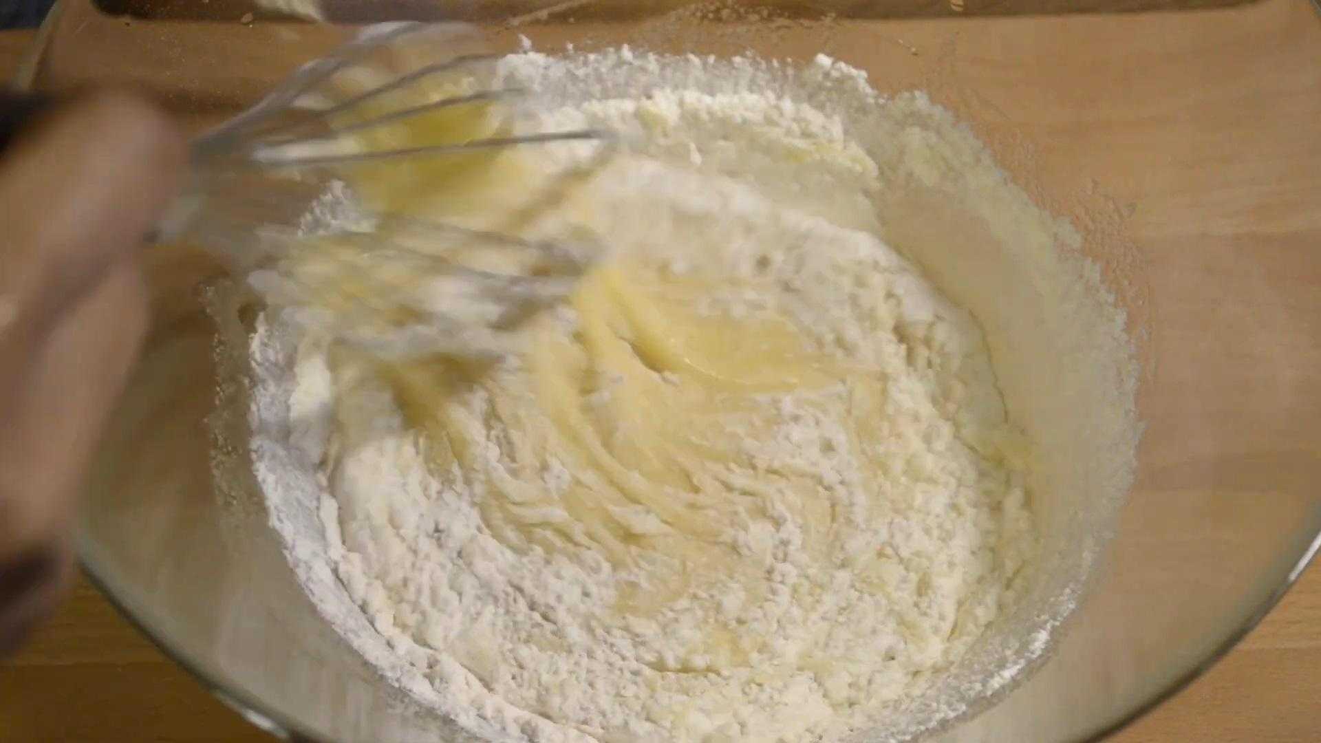 4. Медленно вводим в тесто муку и разрыхлитель. Здесь я перемешиваю уже все только ложкой, чтобы тесто было более легкое.