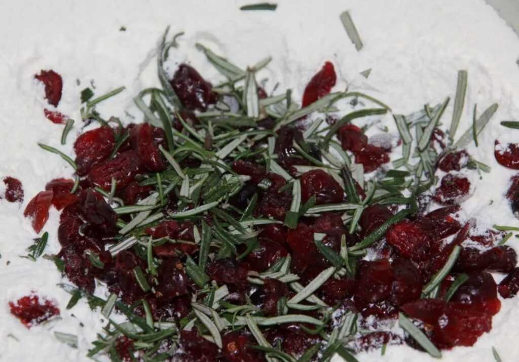 Муку, соль и пищевую соду всыпаем в емкость, к этим компонентам добавляем розмарин и клюкву.