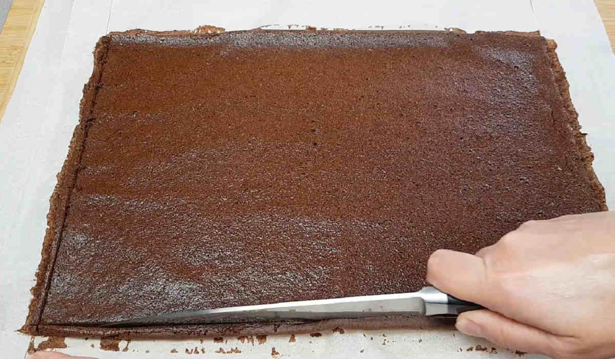 С рулета обрезаем края, разворачиваем, удаляем бумагу, смазываем кремом и снова заворачиваем.