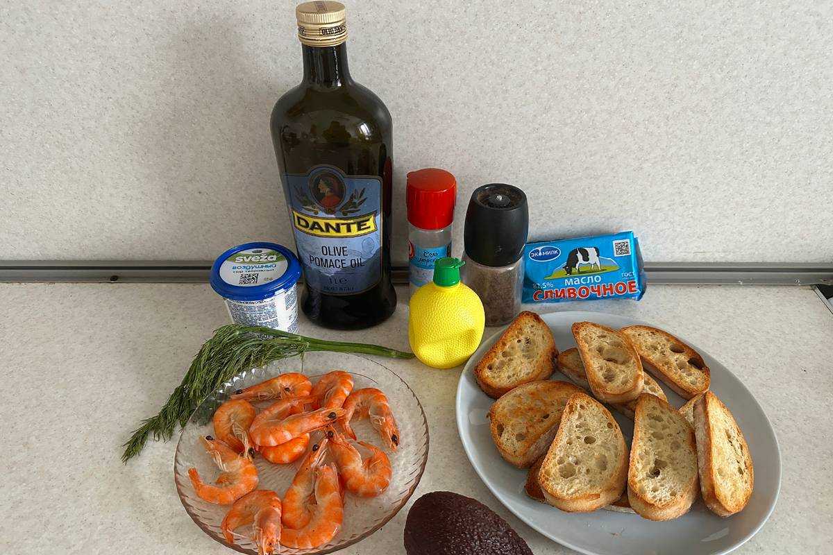 Ингредиенты для брускетты с креветками и авокадо — на 10 штук