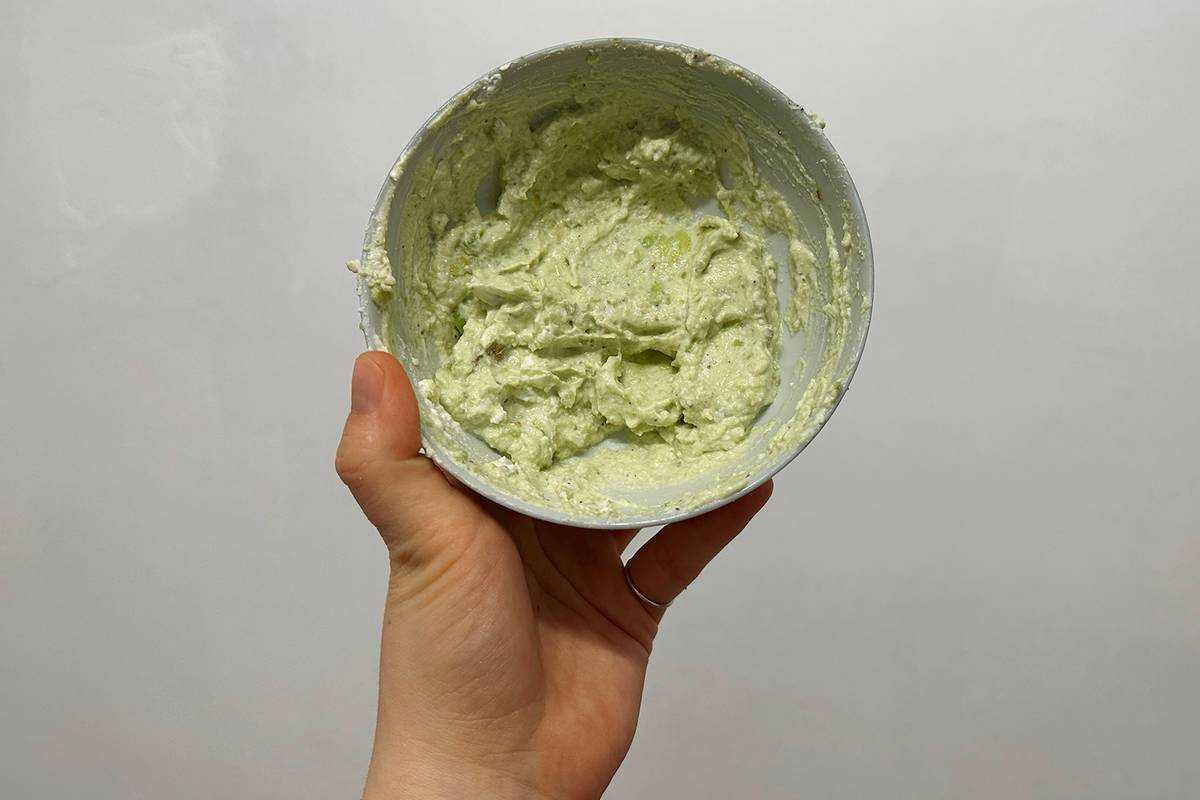 Очень важно не разминать печень трески – она должна хорошо чувствоваться. Не бойтесь сочетать жирное авокадо с жирной печенью – натуральный йогурт их уравновесит и гармонизирует