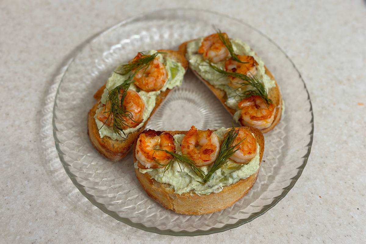 С морепродуктами Брускетта с креветками и авокадо