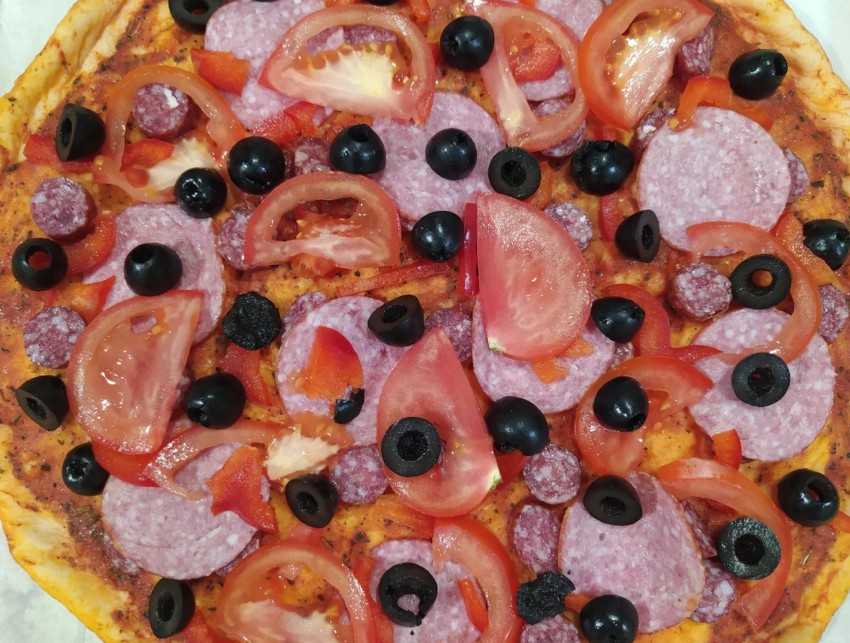 Пицца с охотничьими колбасками, маслинами, моцареллой и помидорами – рецепт с фото