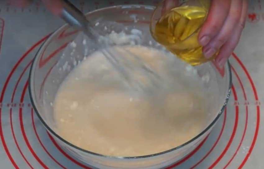 - Масло растопить в микроволновой печи или на плите, смешать с горячей водой (100 мл) и вылить в тесто.