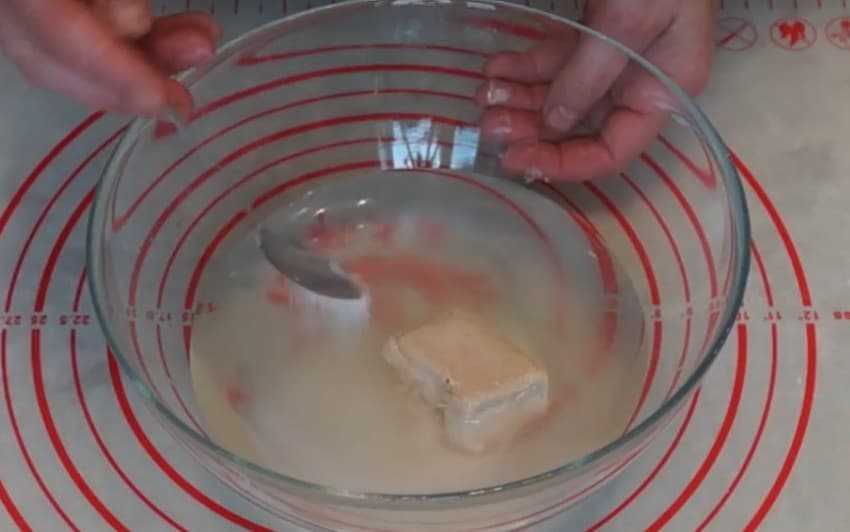 - Добавить 50 мл теплой воды, а оставшиеся 100 мл – нагреть примерно до 80 градусов. Размешать дрожжи с водой и сахаром до однородности. Дать немного постоять, чтобы масса начала пузыриться.