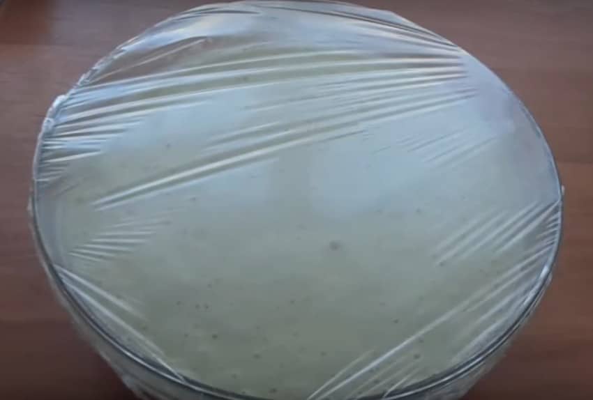 4. Накройте ёмкость пищевой плёнкой и уберите в тёплое место, пока тесто не поднимется.