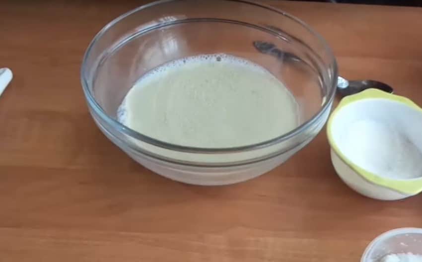 - Разогреть молоко до теплого состояния, но не горячего. Отмерить 50 мл молока с сухими дрожжами, ложкой сахара и поставить опару на 15 минут в сторону.