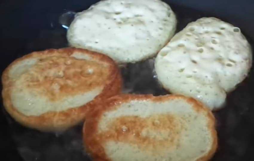 - Оладушки обжариваются на раскаленном масле с двух сторон под закрытой крышкой. В процессе они увеличатся еще примерно в два раза.