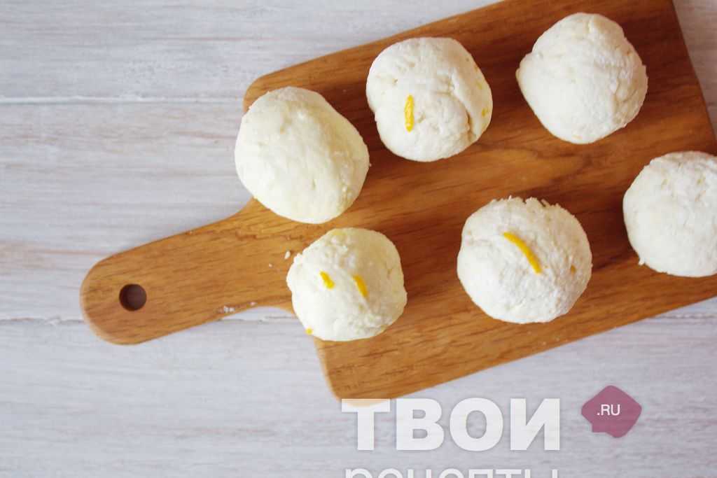 - Из получившегося теста сформировать шарики диаметром примерно 5 см и толщиной 1 см, выложить их на противень.
