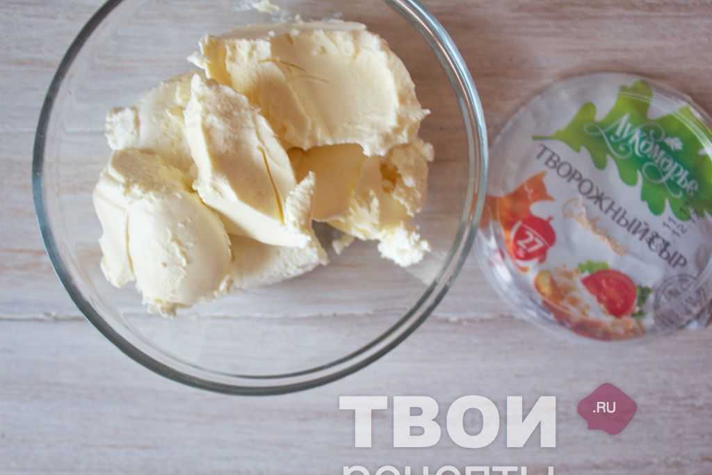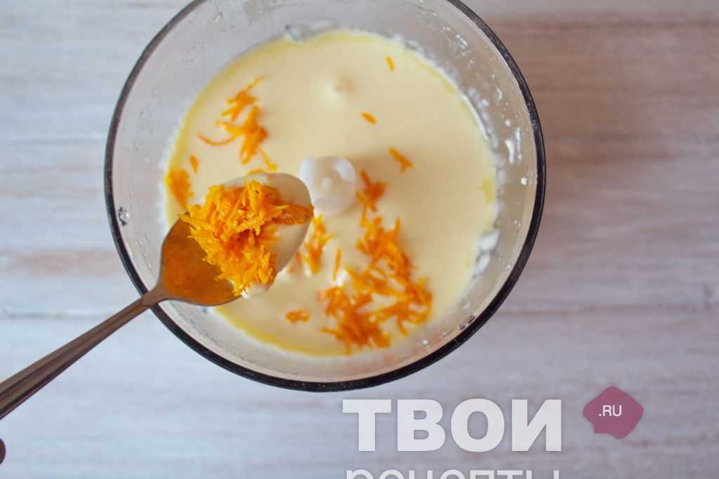 В блендере взбить смесь творога и творожного сыра с яйцом, щепоткой соли и сахаром — добавить апельсиновый фрэш и цедру, снова взбить.