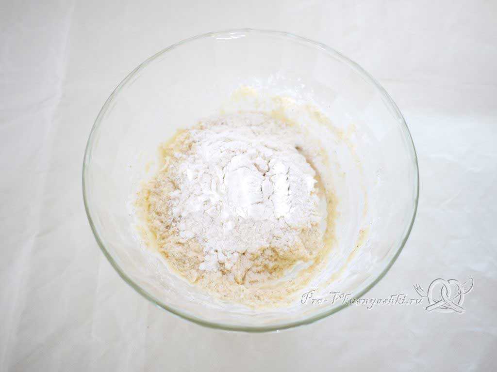 Отложить 50 г муки, остальную просеять и смешать с содой и кислотой. Вместо этого можно разрыхлить тесто пекарским порошком, его добавляют по инструкции на вес муки.