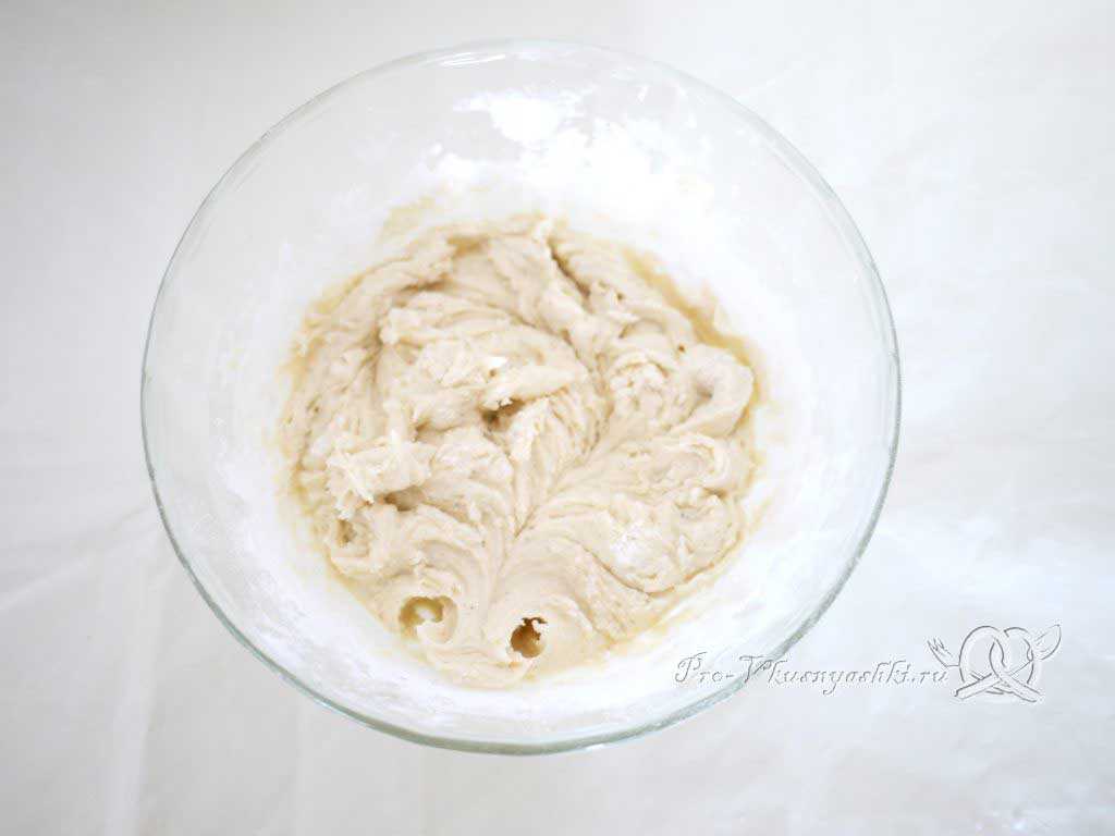 - Соединяем все ингредиенты для теста. Вымешиваем, добавляя понемногу оставшуюся муку. Тесто должно стать достаточно пластичным, но не твердым. Если муки будет недостаточно – добавьте еще немного, чтобы добиться желаемого результата.