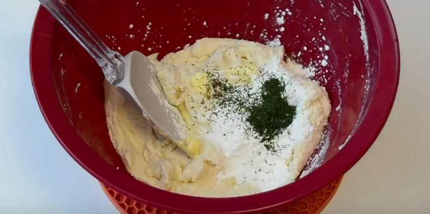 1. В миску влейте кефир комнатной температуры и добавьте соду. Всыпьте овсяные отруби и добавьте творог. Тщательно разомните массу до однородности при помощи картофелемялки. Посолите и снова перемешайте.