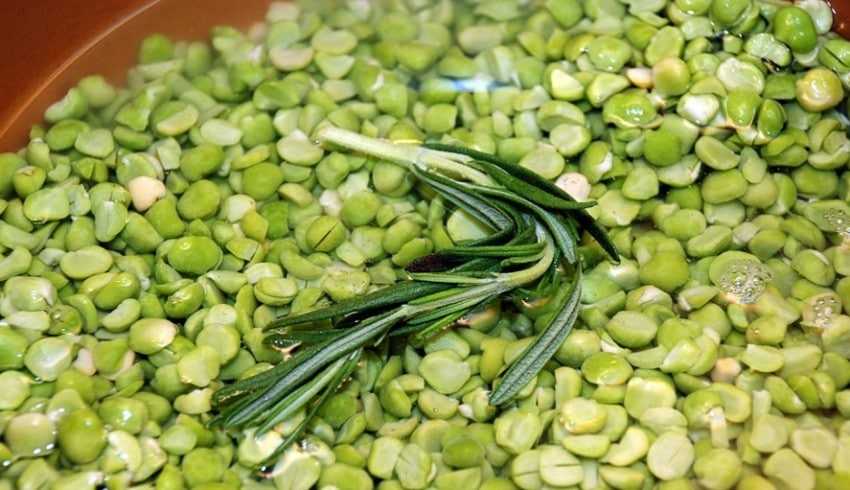 1. Горох замочите минимум на 6-8 часов, лучше на ночь. Потом хорошенько промойте. Переложите в кастрюлю и налейте воды на 10-15 см выше уровня крупы. Добавьте веточку розмарина.