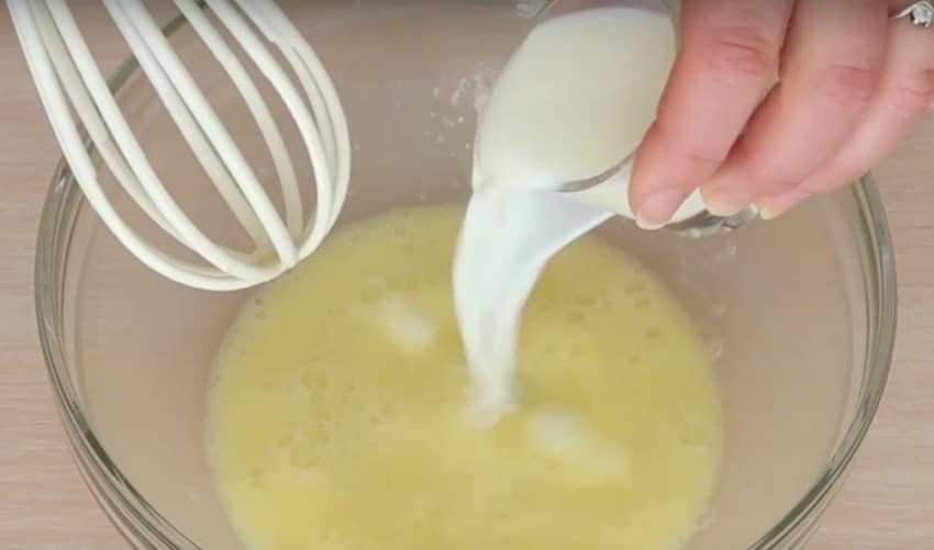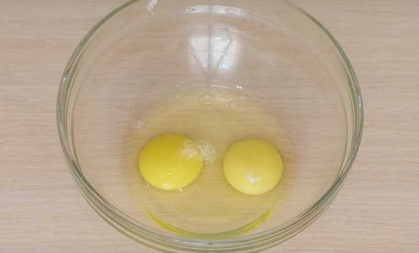 1. Разбейте в миску куриные яйца, перемешайте их с сахаром и солью ручным венчиком.