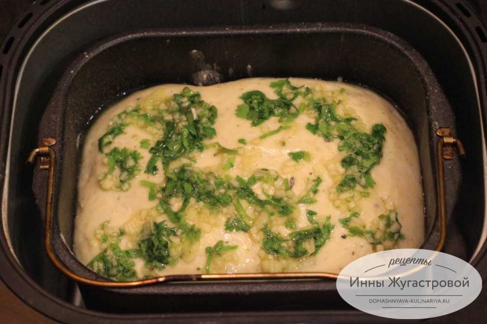 Нажать старт, начнется замес теста, затем хлебопечка переходит к режиму отстаивания и подъема теста. В инструкции написано, что на режиме 4 отстаивание и подъем теста занимают 2 часа 9 минут. Непосредственно выпечка занимает 53 минуты. Значит, к концу второго часа нужно приготовить чесночную заливку. Мелко нарезать зелень, порубить чеснок.