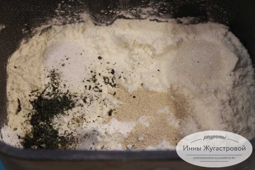 Просеять муку, я использую Подгоренскую муку высшего сорта липецкого производства, высыпать муку в чашу хлебопечки. Разложить в разные углы чаши сахар, соль, дрожжи. Дрожжи у меня сухие быстродействующие Воронежские. Специи можно добавить сразу же, я использую смесь сухих пряных трав —