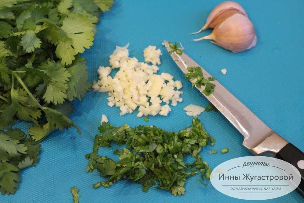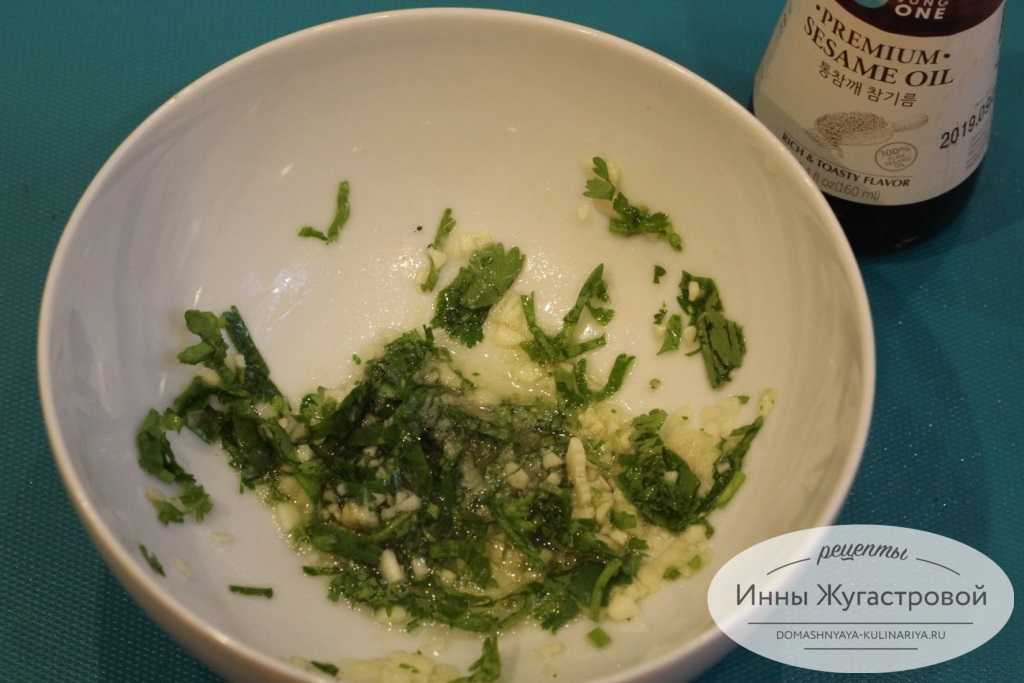 Смешать ложку растительного масла (я люблю в том рецепте ) с водой, добавить щепотку соли, зелень и чеснок.