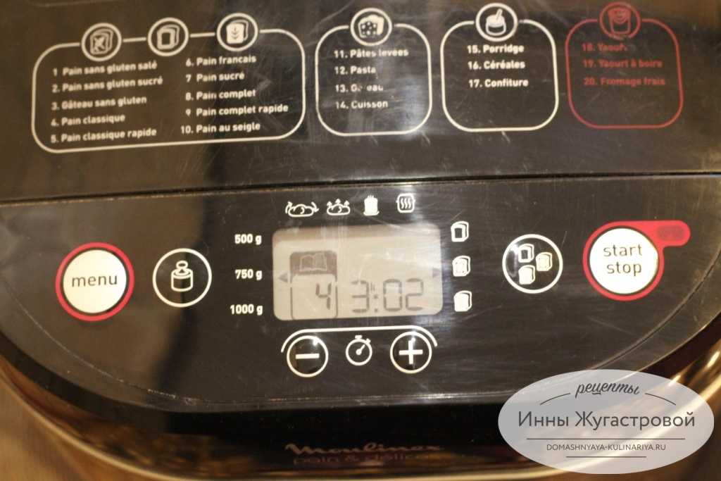 Установить чашу в хлебопечку, задать программу. В моей модели классический белый хлеб — программа 4. Задать вес (750 грамм) и цвет корочки — средняя. Хлебопечка сама выставляет время — 3 часа 2 минуты. Выход готовой буханки чуть более 500 грамм (510-520 грамм).