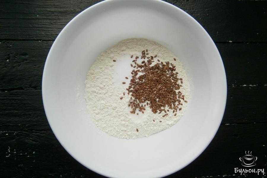 В муку всыпать соль, семена льна и сахар, все перемешать.