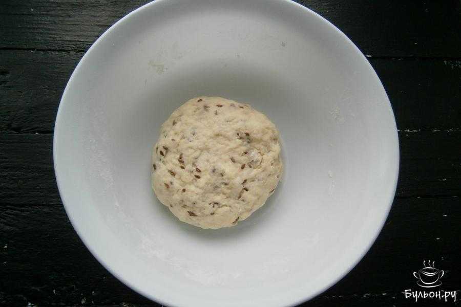 Добавьте семена льна, черный молотый перец. Снова вымесите. Соберите тесто в шар. Положите в пакет и отправьте в холодильник на 1 час. За это время масло сливочное, входящее в состав теста снова замерзнет. Тесто станет плотнее и удобнее в работе. У теста появиться эластичность и с ним будет легче работать.