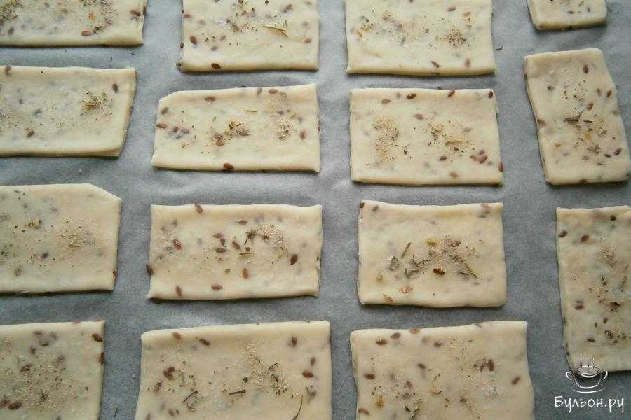 Аккуратно переложить будущие крекеры на противень, застеленный пергаментом.