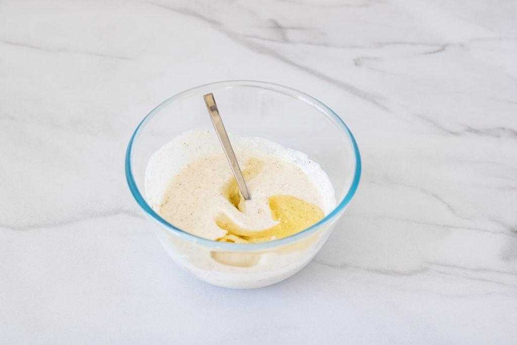 Затем венчиком соедините всё и добавьте раст. масло. В этом рецепте можно использовать любое масло (домашнее или магазинное).