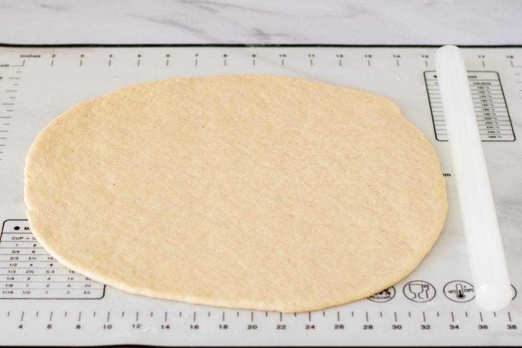 2. Тесто вымешайте 5 минут на столе, затем поместите в миску, прикройте и дайте отлежатся 20 минут. Затем нам нужно раскатать его в пласт 1 см.