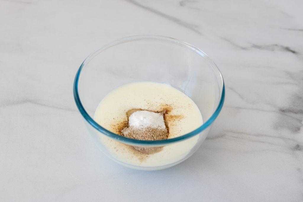 2. Кефир смешайте с обоими видами сахара. Также можете использовать ванильный экстракт для более выраженного аромата. Чтобы сахар лучше растворялся, кефир должен быть теплым.