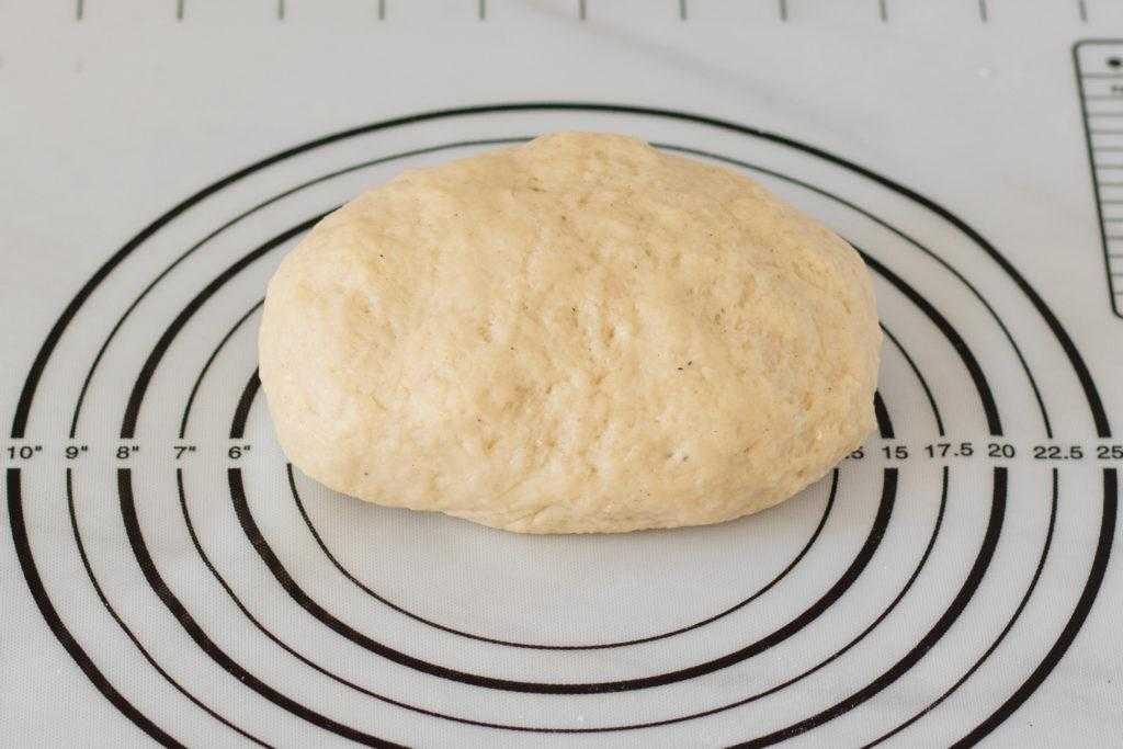 3. Оставшиеся 50 гр. муки высыпать на рабочую поверхность и переложить в нее густое тесто. Хорошо его вымесить, чтобы оно стало упругим и одновременно очень тугим шаром.