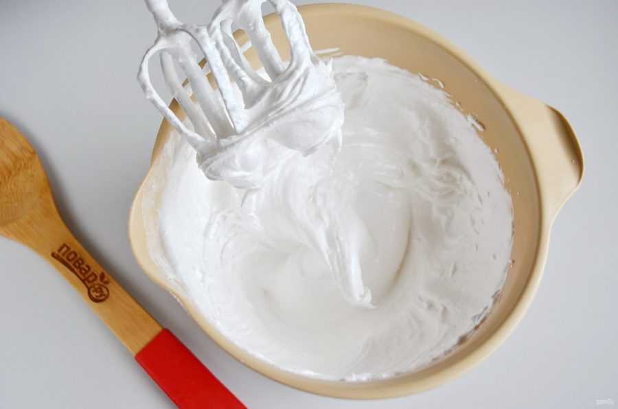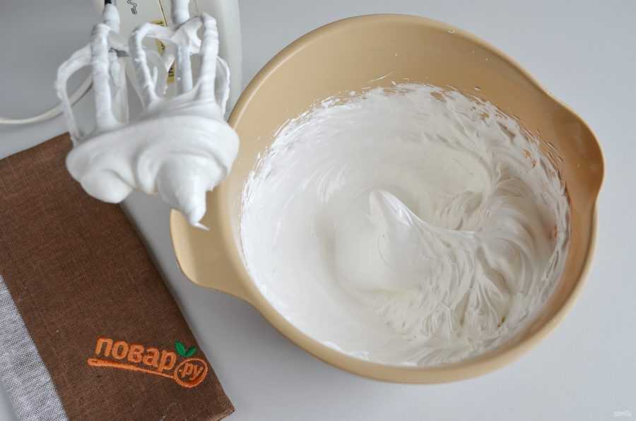 - Взбейте белки до такого состояния, чтобы они оставались на ложке, даже если ее перевернуть.