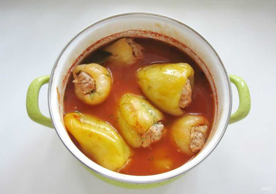 Перцы вымойте, срежьте верхушки, сбоку на нескольких перцах вырежьте треугольные очи и зубастый рот, наполните фаршем. Выложите перцы в большую кастрюлю, добавьте лавровый лист, томатную пасту и залейте водой до половины кастрюли.