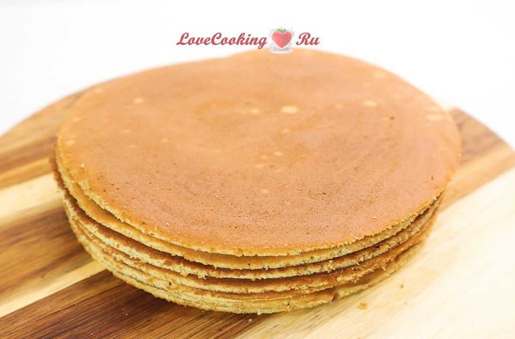 Смешав мед с яйцами, ввести просеянную муку. Тесто выйдет довольно жидким, но не будет растекаться при формировании коржей. На пергаментную бумагу нанести тесто тонким слоем (в виде круга или прямоугольника – как нравится). Выпекать в течение 5-7 минут при 180 градусах. Выпечь по этой схеме все тесто, остудить, подровнять (обрезки не выкидывать!).