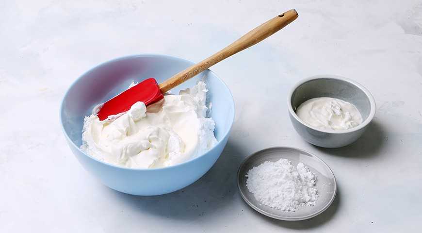 Взбить сливки с сахарной пудрой, аккуратно вмешать сыр. Крем-чиз готов.