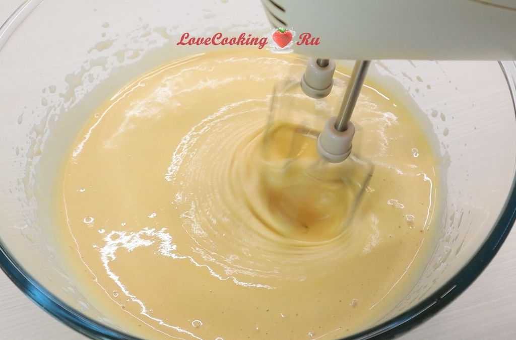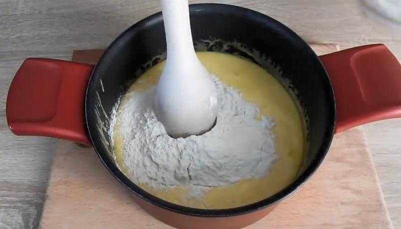- Остудить получившуюся массу в течение получаса, добавить яйца и муку небольшими порциями, перемешивая венчиком.