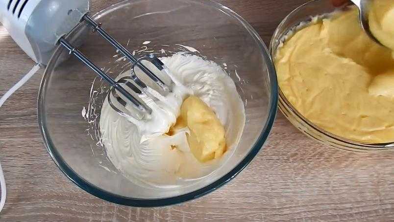 Если используются сливки – взбить их в крепкую пену и осторожно ввести в остывший крем. Чтобы он получился более стабильным и не растекался при формовке торта, его желательно выдержать в холодильнике в течение 1-2 часов.