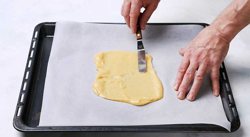Поставьте миску с тестом на весы, обнулите показания и половником или лопаткой переложите из нее на застеленный бумагой противень нужное количество теста. Быстро разровняйте тесто по бумаге спатулой или лопаткой. Тяните, тяните к углам, его точно хватит! Старайтесь, чтобы тесто было одной толщины по всей площади.