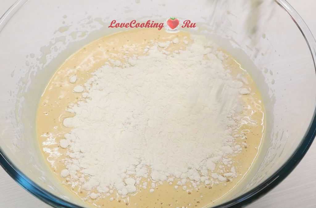 В пару приемов ввести муку — понадобится 170 грамм. Тесто должно получиться густым, чтобы вы могли брать его ложкой