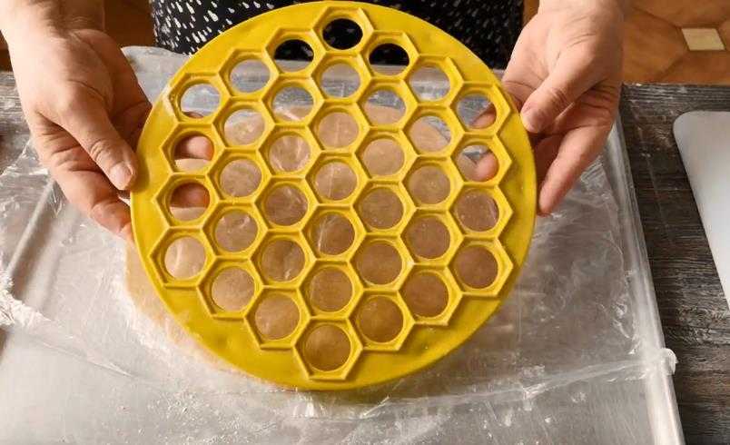 - Раскатать заготовки максимально тонко скалкой в 10 одинаковых коржиков. Вырезать специальной формой-вырубкой одинаковые круги, густо проткнуть зубочисткой, выпечь вместе с обрезками на противне 2 минуты при температуре 180˚.