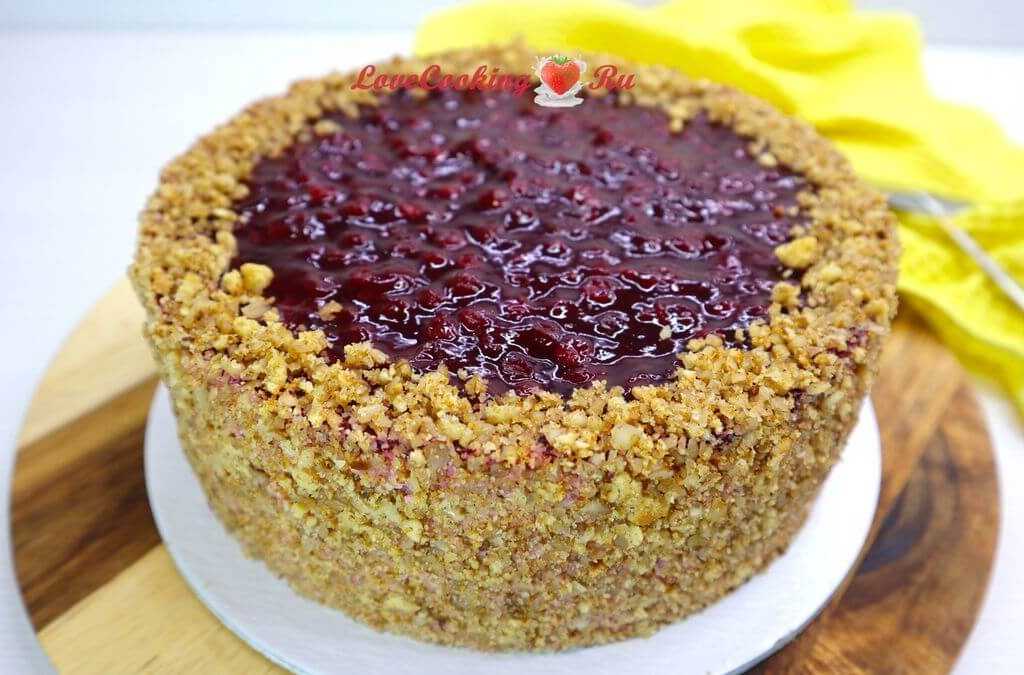 Обильно промазать остывшие коржи, сложить их друг на друга. Обрезки перемолоть в крошку, обсыпать ею готовый торт. После 2-3-часовой пропитки можно резать и пробовать.