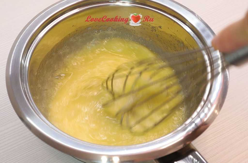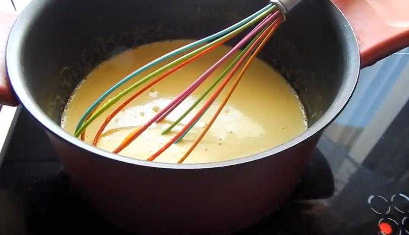 5. А пока есть свободное время – приготовим вкуснейший заварной крем. С ним тоже не будем долго возиться – сразу отправляем в удобный толстодонный сотейник оставшийся обычный и ванильный сахар, два яйца, 3 ложки муки и вливаем молоко. Взбиваем миксером до однородности и только потом ставим на плиту. Выставляем средний уровень нагрева конфорки. Не переставая помешивать, доводим смесь до кипения и убавляем температуру до минимума. Увариваем крем до загустения – должна получиться консистенция сметаны.