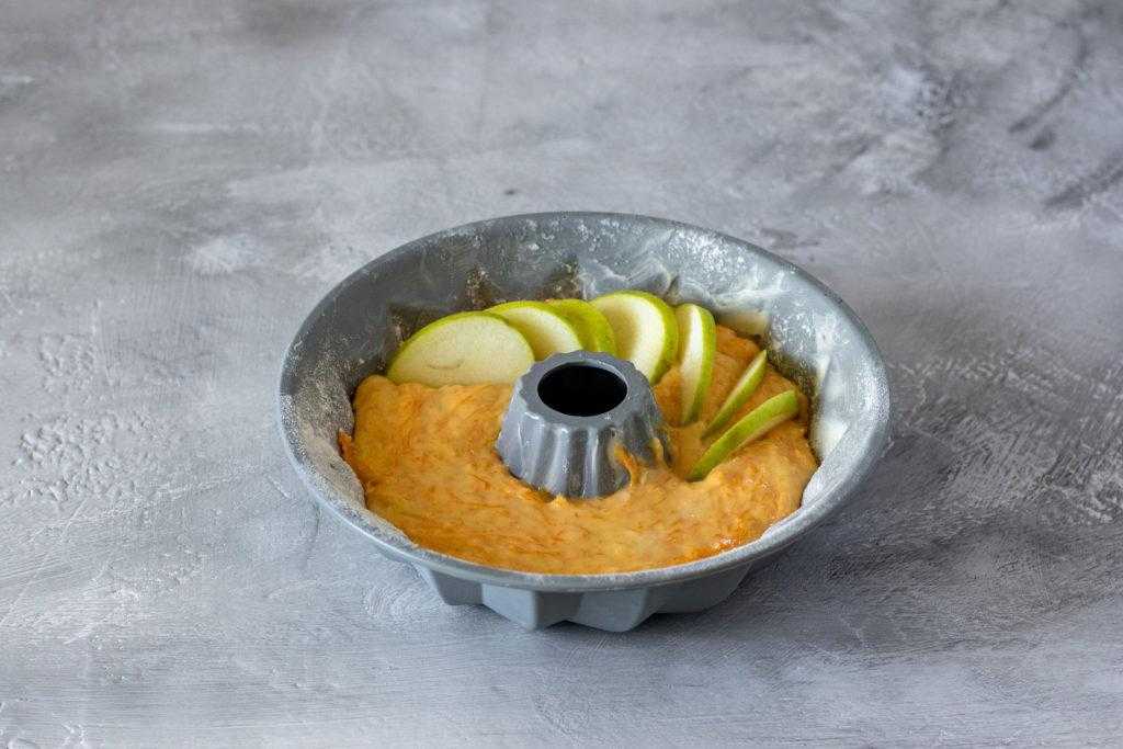 9. Подготовьте форму и перелейте в нее тесто. Сверху вставьте яблоки под небольшим углом, чтобы получился узор. Выпекайте при 180 градусах около 40 минут. При выпекании фрукты почти скроются в тесте.
