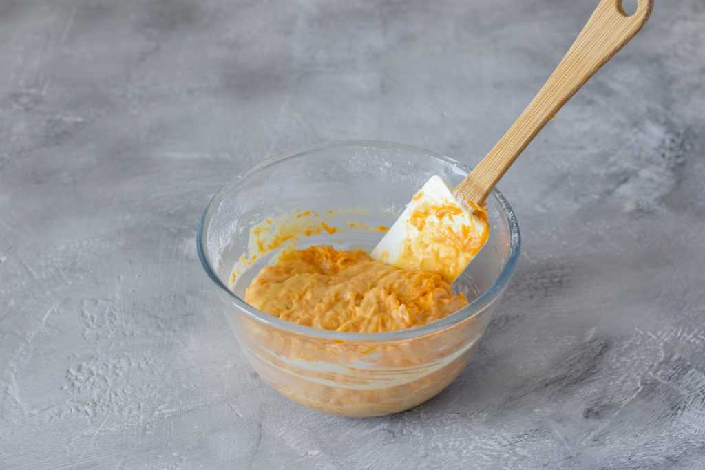7. Добавьте натертую тыкву в тесто. Объедините. Тесто должно получиться достаточно густым, чтобы легко удерживать яблоки на конечных этапах приготовления пирога.