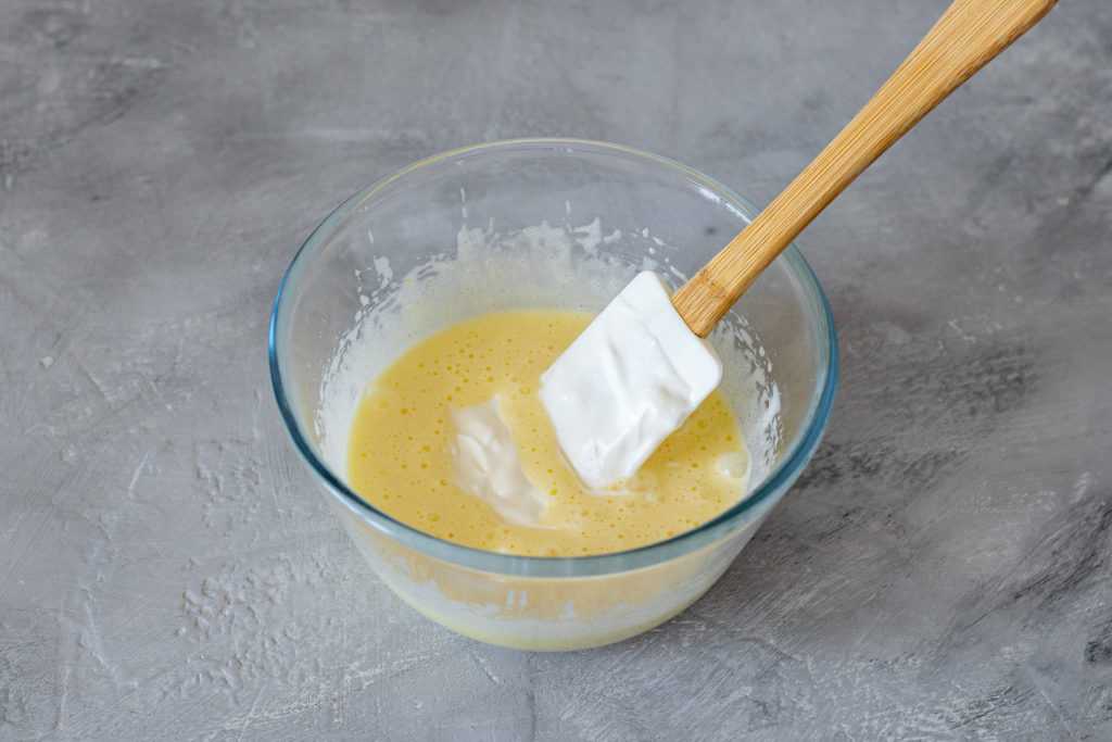 - В глубокой миске вилкой взбиваем яйца с натуральным йогуртом. Вводим рисовую муку, добавляем соль, перемешиваем до однородности.