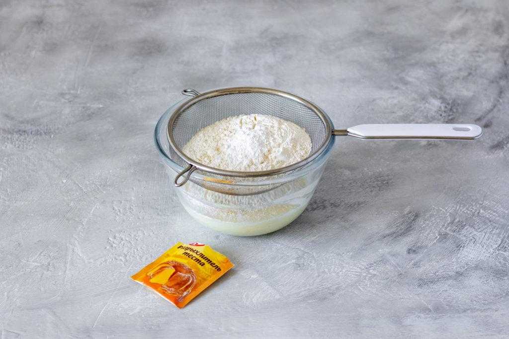 6. Просейте муку и разрыхлитель к остальным ингредиентам.