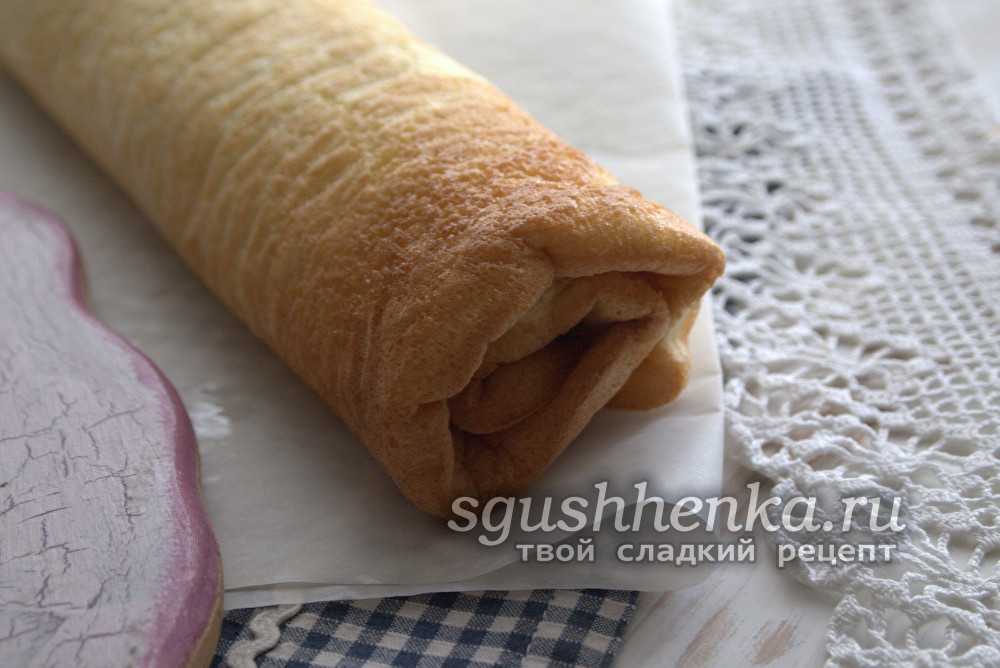 Рулет должен получиться с хрустящей верхней корочкой, а внутри иметь нежную мягкую структуру.