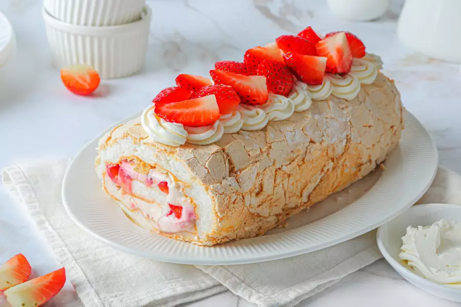 Воздушный рулет из невесомой меренги с нежнейшим кремом из сыра маскарпоне с прослойкой клубники – это ошеломляюще вкусно! Тут даже слова излишни…
