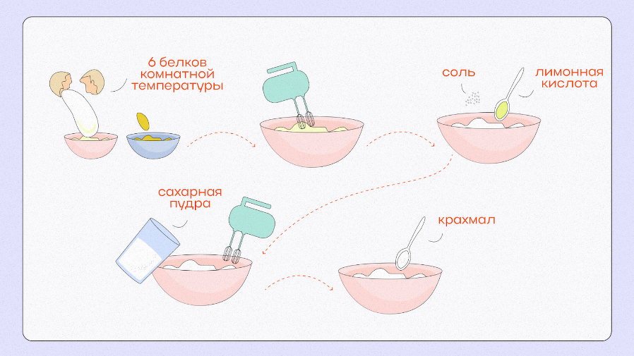 В рецептуру обязательно входит крахмал для хрупкости. Его добавляют на финишной стадии взбивания, не забыв дважды просеять. Многие спрашивают, чем заменить кукурузный крахмал в меренге? По примеру шеф-кондитеров в плотную пену можно насыпать миндальную или ореховую муку в таком же количестве.