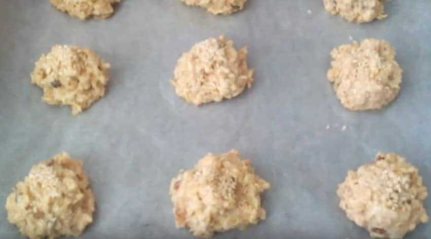 Из всех ингредиентов нужно замесить однородное тесто и обязательно дать ему настояться. Это нужно для того, чтобы овсянка разбухла и не осталась сухой в готовом печенье. Затем мокрыми руками сформировать печенье, выложить на противень и убрать в духовку до готовности.