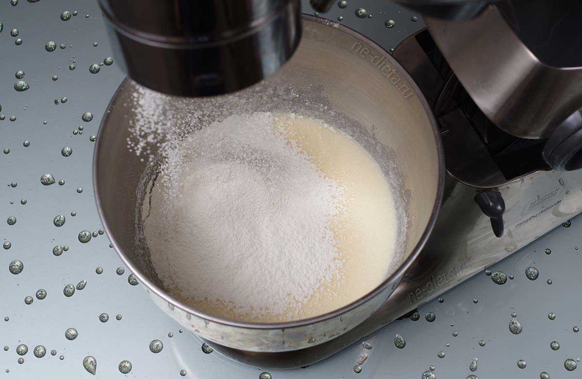 3. Порциями в 2 – 3 захода всыпать муку, просеянную с солью и разрыхлителем, и хорошо вымесить тесто до гладкости и однородности.